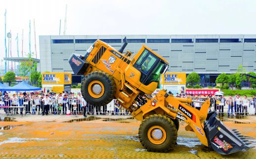 5月17日,2019长沙国际工程机械展览会机械装备技能展演,挖机驾驶员操控装载机表演街舞。湖南日报记者 唐俊 摄