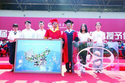 在湖南农业大学2019届本科生毕业典礼暨学士学位授予仪式上,该校党委书记陈弘和校长、中国工程院院士邹学校代表学校收到两份特殊的礼物——一份由205个本科行政班,205张笑脸,4773份祝福,镶嵌在中国地图上,寓意着2019届毕业生将奔赴祖国的四面八方建功立业,用笑脸迎接新中国成立70周年和新时代美好明天的青春毕业册;另一份是以“立足三湘,服务三农”为主题设计的艺术作品,表达了母校与祖国母亲同生长,农大学子与母校共同致力于祖国乡村振兴的责任与担当。