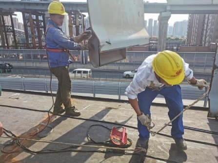 焊花飞溅,被汗水浸湿的衣服贴在他身上。20分钟后,一块2米长的护栏基本焊好了,此刻他的脸上汗如雨下。“这样的速度还算快,但一下午最多也就装15块左右。”柴鹏告诉记者,这只是初步的安装,还要等专业的焊工再进行一轮电焊固定。
