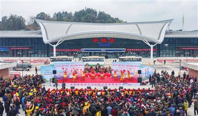 12月26日下午,桑植站广场外,桑植县组织文艺演出庆祝高铁开进革命老区。吴成华 摄