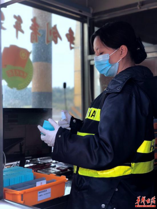 左千靖,长沙高速普迹中心站收费员,正在给CPC卡消毒。在站执守14天的她说,明天起高速公路开始收费了,来往车辆越多,我们不但要坚持好文明服务,执行好“三不一优先”措施,同时对疫情防控更是不能松懈,“希望疫情早点过去,愿祖国一切安好!武汉加油,中国加油!”
