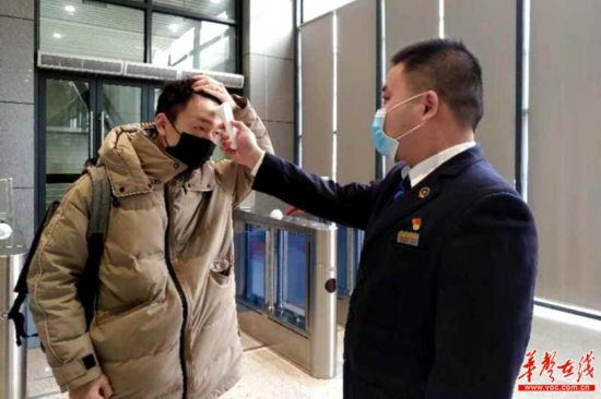 米武,长株潭城际先锋站站长,正在为乘客测量体温。疫情发生以来,他带领先锋站全体人员坚守岗位,严格落实上级要求。对于站房消毒,不放过任何一个角落。同时,他协调各单位将所属的设备定期进行清理、杀菌。由于米武的“唠叨”,先锋站同事看到米武都学会抢答了:“好的、洗手、消毒、喷酒精!”