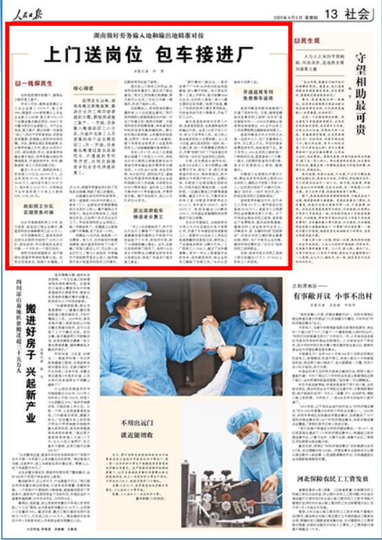 早在3月初,湖南省规模以上工业企业复工15776户,复工率98%;调查的1246家规模以上农业企业复工1208家,复工率97%;173个在建省重点建设项目、3668个市州重点项目已全部复工。对于企业来说,复工复产,要过的第一关就是“招工”;而对于求职者来说,求职信息很重要,返程路上的防护也很关键。对此,湖南各地区因地施策,长沙等劳务输入大市,派出60多支小分队,前往湘西、怀化、娄底等劳务输出集中地区;而劳务输出地区则精准服务,开通返岗专车、专列,解除返岗、务工人员的后顾之忧。