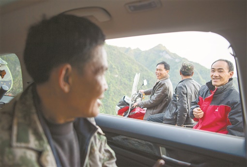 4月24日,桑植县龙潭坪镇红军村,护林员在交流巡山情况。该村有森林面积近43平方公里。为实施生态扶贫,省军区驻村帮扶工作队经对接主管部门,在村里设置了14个护林员岗位,安排了14名建档立卡贫困户就业,人均每年可增收1万元。记者 唐俊 摄