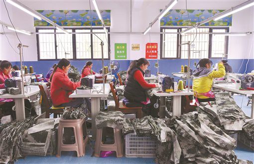 4月24日,新宁县水庙镇枧杆山村,村民在扶贫车间生产服装。该车间于2019年6月投产,经过免费技术培训,安置了14名农村妇女在家门口就业,每人每月可收入1500元以上。记者 童迪 摄