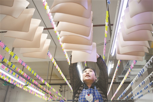 4月29日,新化县曹家镇水竹村鑫盛手袋工艺有限责任公司,村民李娇云在加工皮料。她的月工资达5000余元。该公司年均生产手袋300万个,销往30多个国家和地区,安置了500余人就业,其中贫困村民70余人。 记者 傅聪 摄