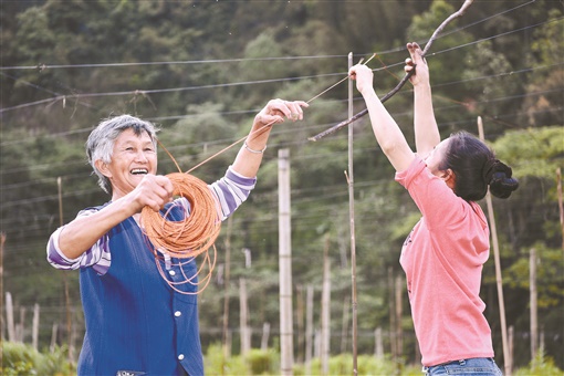 4月28日,城步苗族自治县汀坪乡龙塘村,62岁的易金凤在家门口的百香果基地搭棚架。该村利用独有的气候条件,种植百香果300余亩,每年能吸纳80余名贫困村民就业,务工村民每年人均可收入近万元。记者 童迪 摄