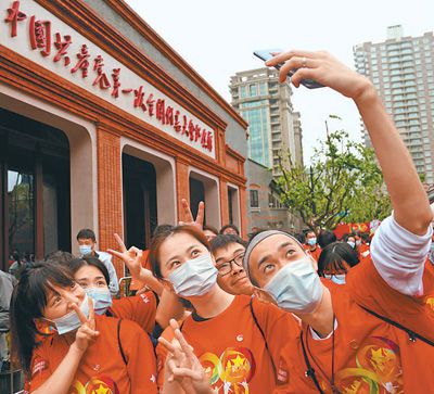 5月4日,在中共一大纪念馆国旗广场,参加五四主题集会的青年们在自拍合影。新华社记者 刘 颖摄
