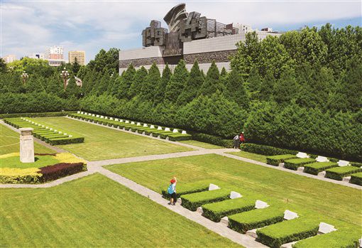 松柏苍翠,耸立包围。烈士陵园东西两个墓地里,庄重肃静,一排排烈士墓整齐如队列。
