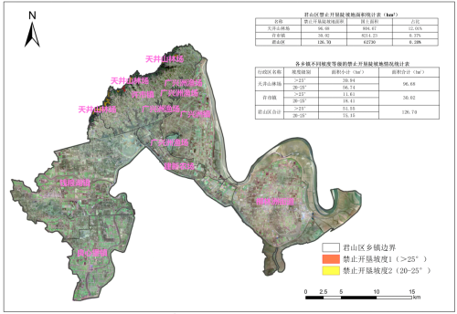 一、君山区禁止开垦陡坡地范围为坡度20至25度特殊地质、25度以上且位于耕地保护红线外的林地、草地、裸土地,全市划定禁止开垦陡坡地面积126.70平方公里,涉及天井山林场、许市镇等2个乡镇。具体分布范围和面积见附件。