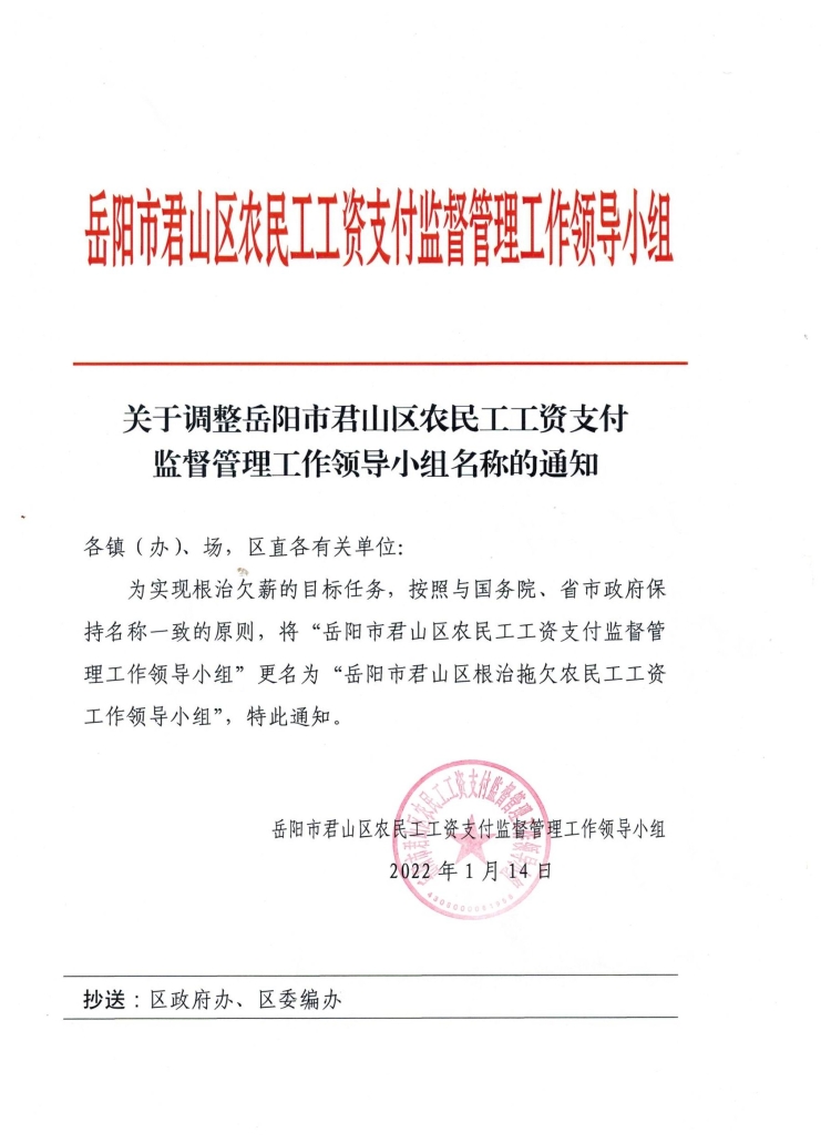 关于调整岳阳市君山区农民工工资支付监督管理工作领导小组名称的通知