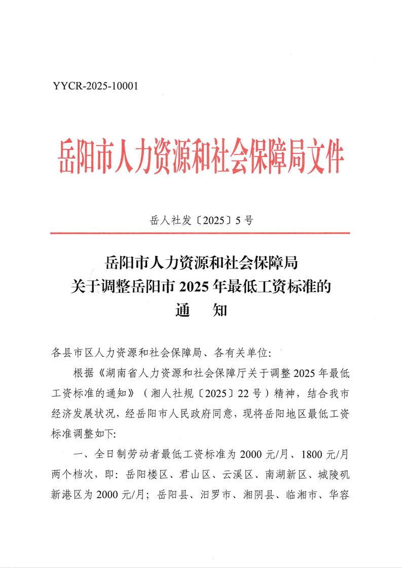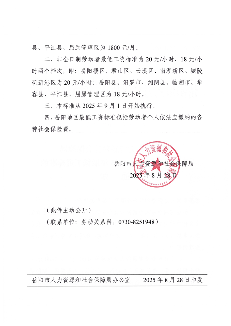岳阳市人力资源和社会保障局关于调整岳阳市2025年最低工资标准的通知