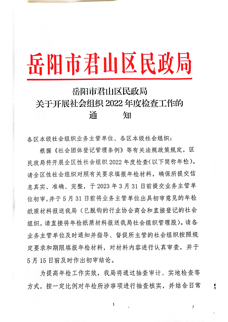 岳阳市君山区民政局关于开展社会组织2022年度检查工作的通知