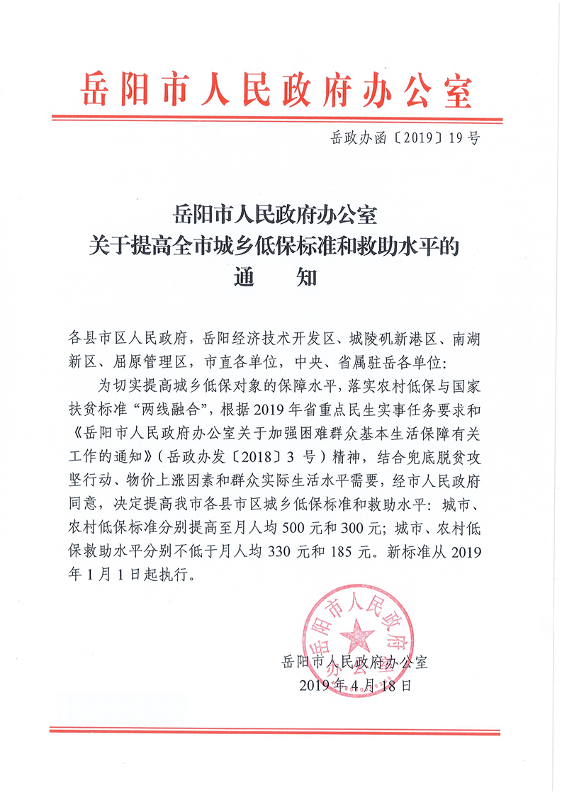 岳阳市人民政府办公室关于提高全市城乡低保标准和救助水平的通知