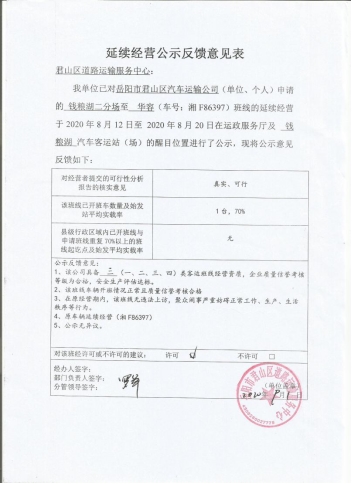 关于君山汽运公司县际班线湘F86397(钱粮湖二分场-华容)延续经营的公示