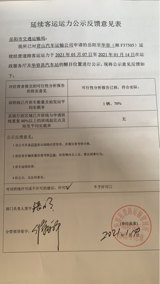 现将我局受理的道路旅客运输相关事项进行公示,如有意见或建议的,请于公示之日起5个工作日内书面向我局行政审批股反映,并在反映材料上署名,所反映的内容必须真实。