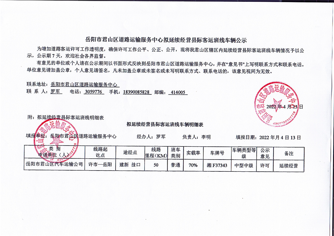 许市至岳阳班线(湘F37343)延续经营公示