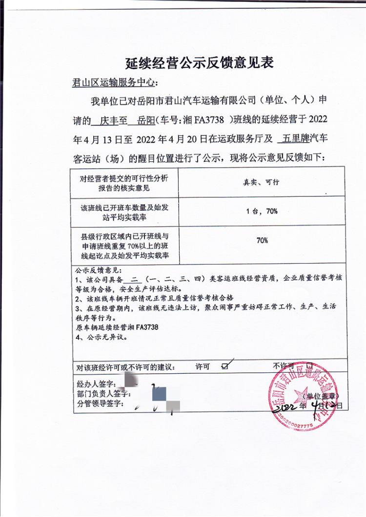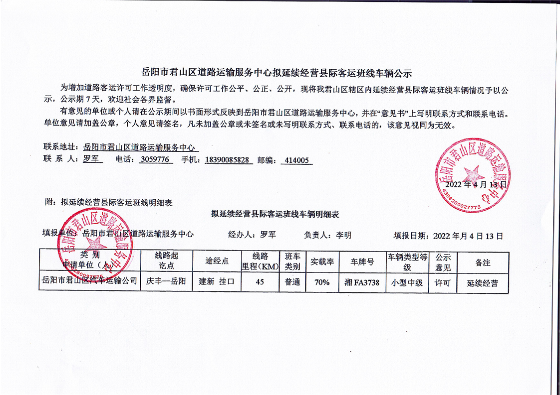 庆丰至岳阳班线(湘FA3738)延续经营公示