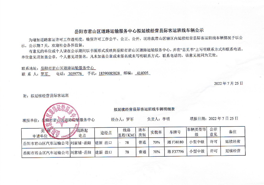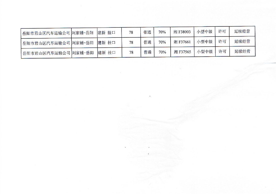 刘家铺至岳阳(湘F38180、湘F37796、湘F38003、湘F37661、湘F37565)延续经营公示