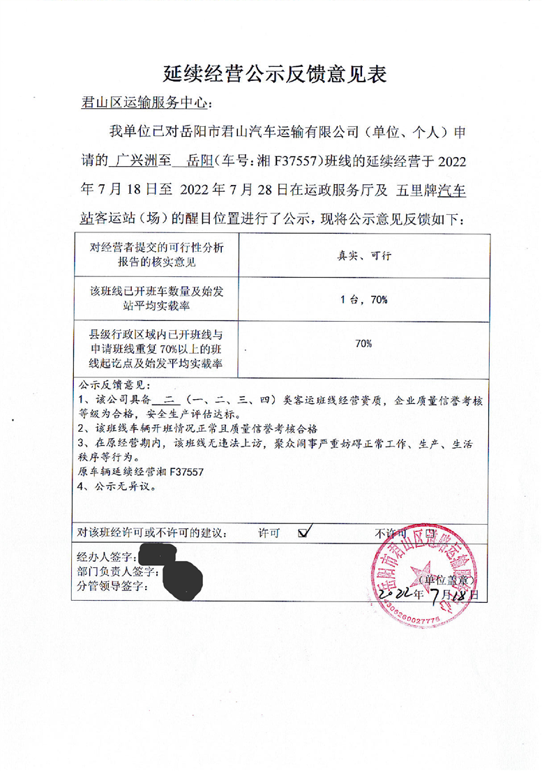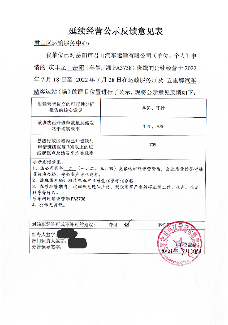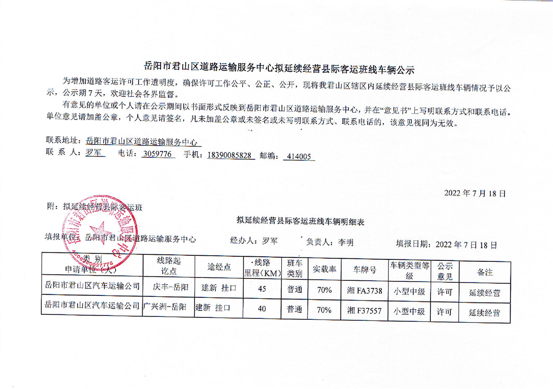 广兴洲至岳阳班线(湘F37557)庆丰至岳阳班线(FA3738)延续经营(2022年8月—10月)