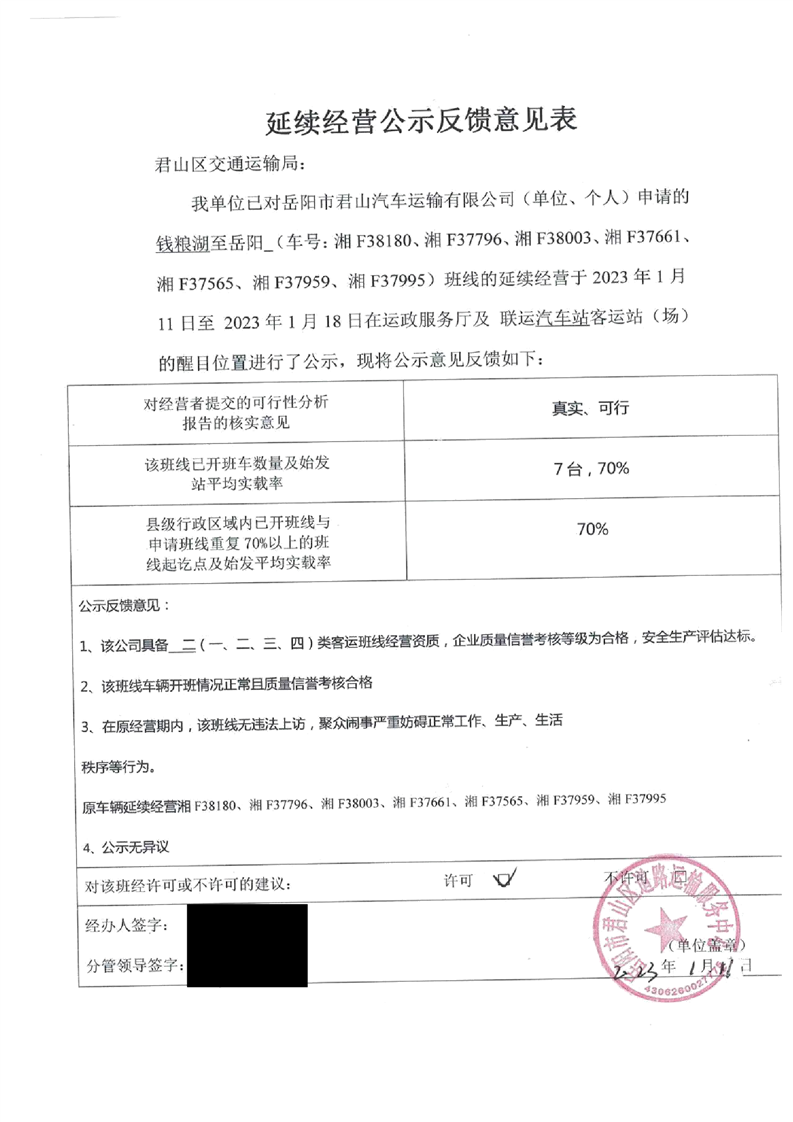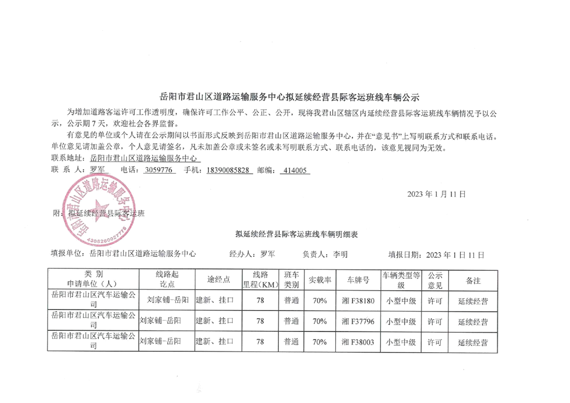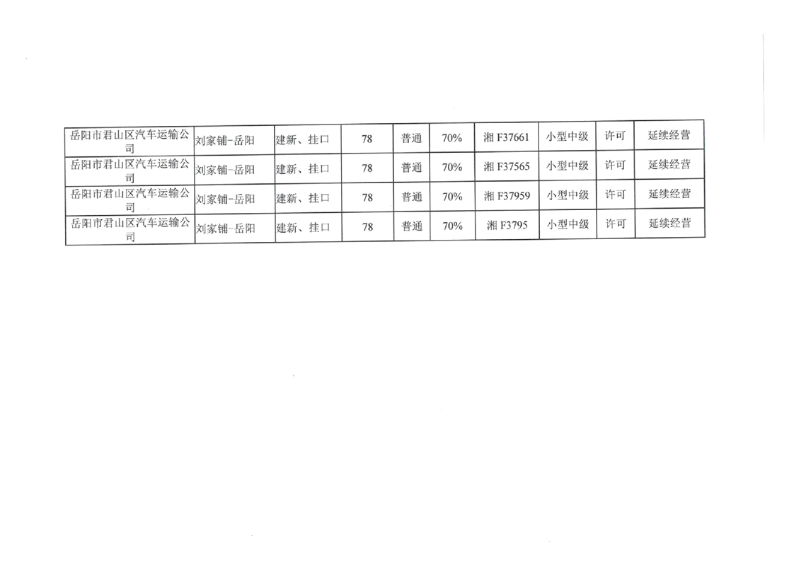 刘家铺至岳阳(湘F38180.37796.38003.37661.37565.37959.37995)延续经营公示