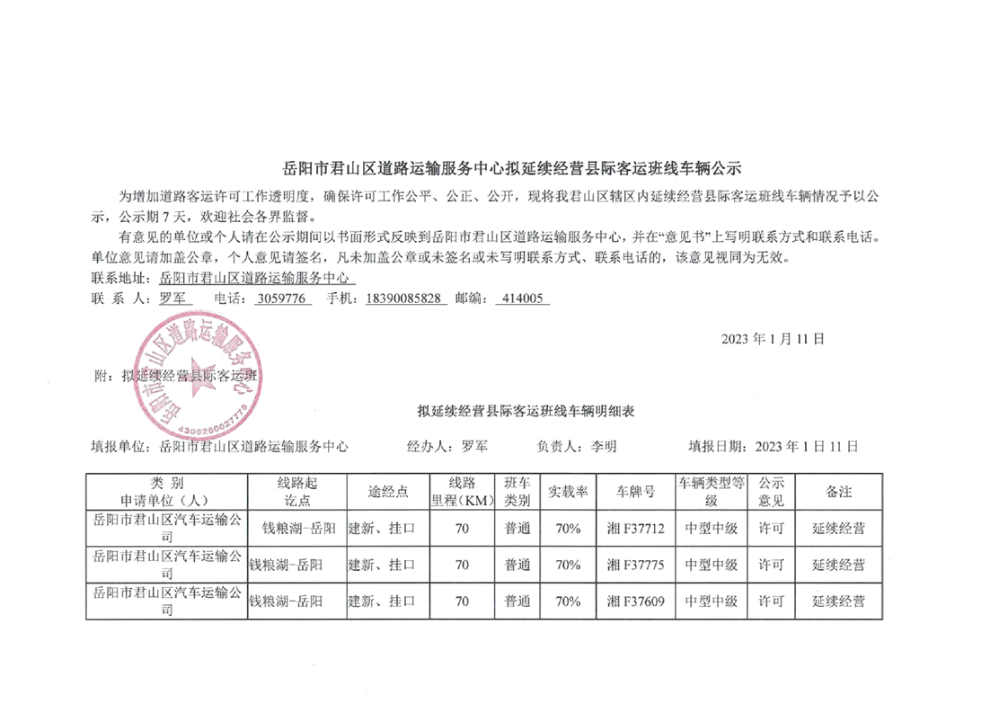 钱粮湖至岳阳(湘F37712.37775.37609.37638.37619.38012.37881.37955.37108.37938.37728)延续经营公示