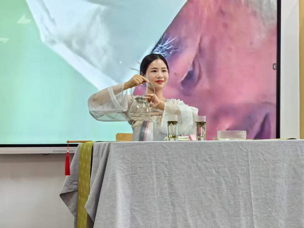活动现场,原创节目君山银针茶艺表演尤为亮眼。茶艺师身着传统服饰,以行云流水般的动作展示君山银针“三起三落”的冲泡技艺,清香茶韵让观众沉浸式感受非遗魅力。非遗展板区域同样人气十足,图文并茂的展板详细介绍了我区非遗项目的历史渊源与传承现状,文化志愿者们穿梭其间,用生动易懂的语言为参观者讲解非遗知识,解答疑问,搭建起非遗与大众之间的沟通桥梁。