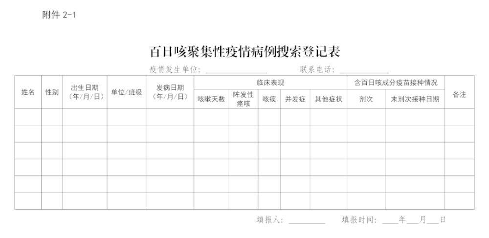 (一)病例搜索。根据《诊疗方案》中疑似病例的定义,在涉及聚集性疫情的集体单位、相关医疗机构开展病例搜索,并评估疫情波及范围。对发生聚集性疫情的托幼机构、学校,核查晨午检记录和因病缺勤缺课记录;对发生聚集性疫情的其他集体单位,核查员工缺勤、请假记录。病例搜索过程中填写《百日咳聚集性疫情病例搜索登记表》(附件2—1)。
