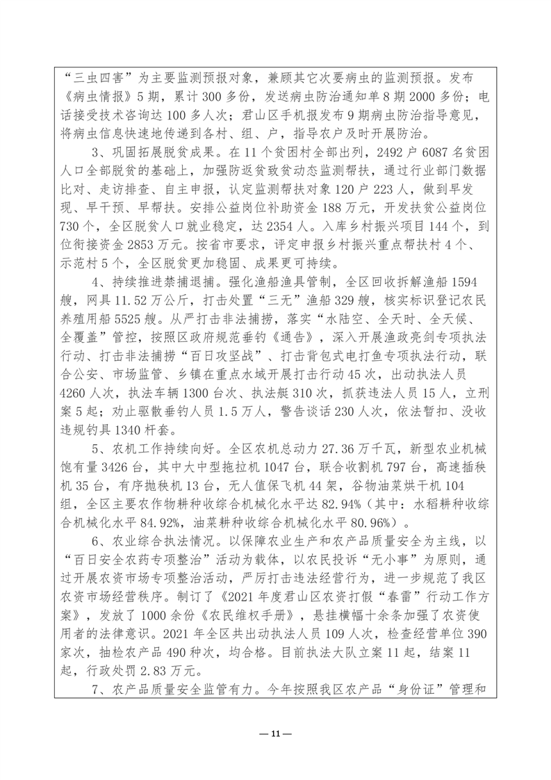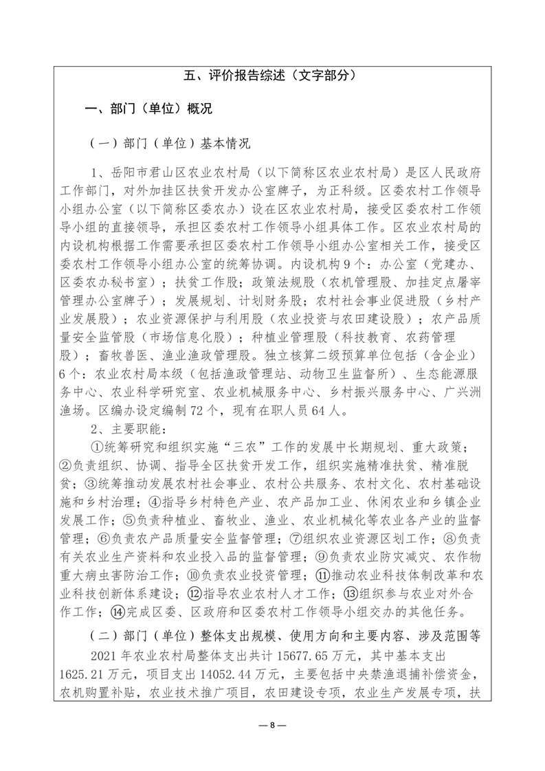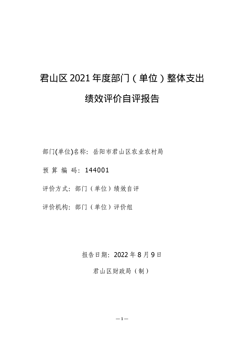 君山区2021年度农业农村局整体支出绩效评价自评报告