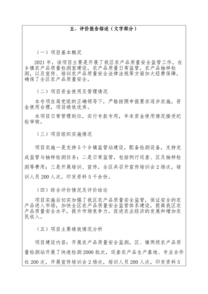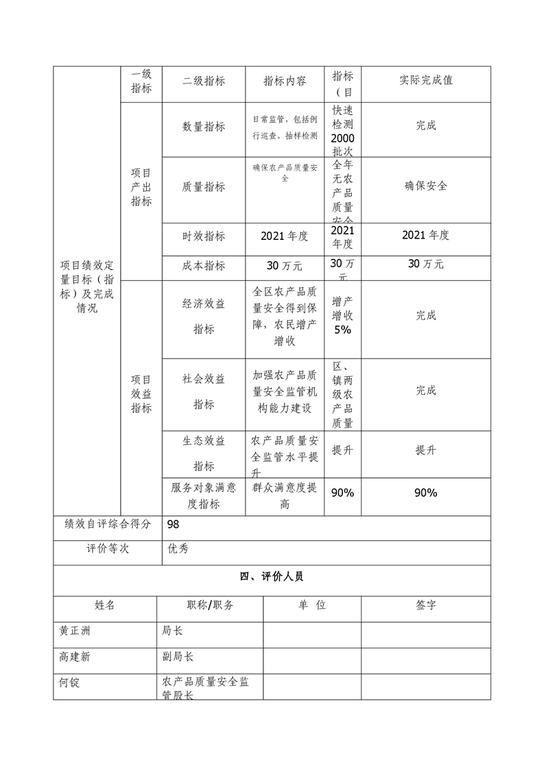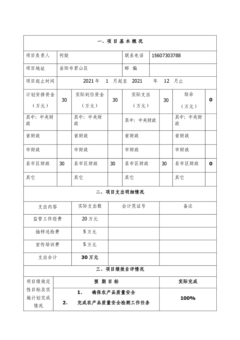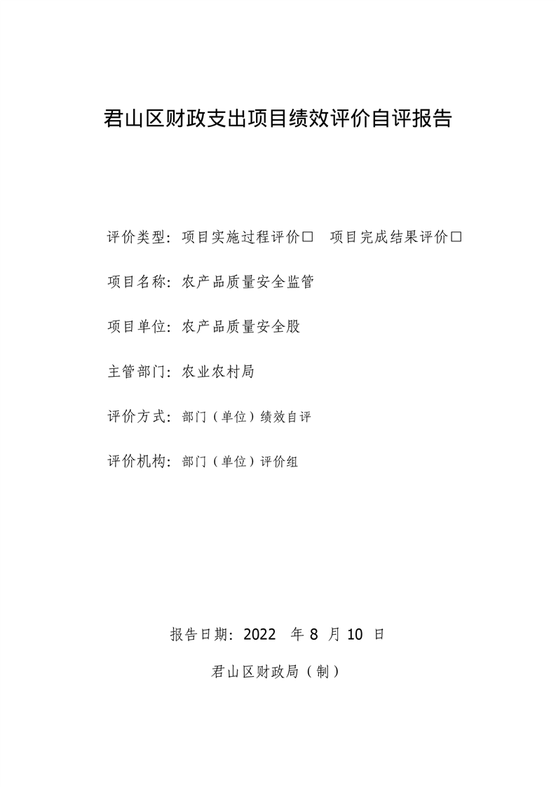 2021年度君山区农业农村局农产品质量安全监管项目绩效评价自评报告
