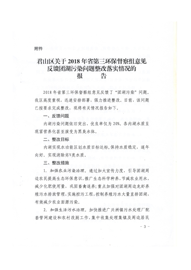 君山区关于2018年省第三环保督察组意见反馈团湖污染问题整改落实情况的报告