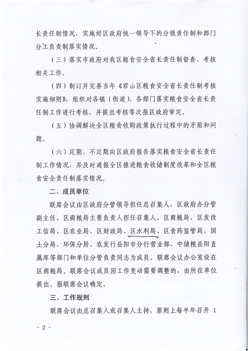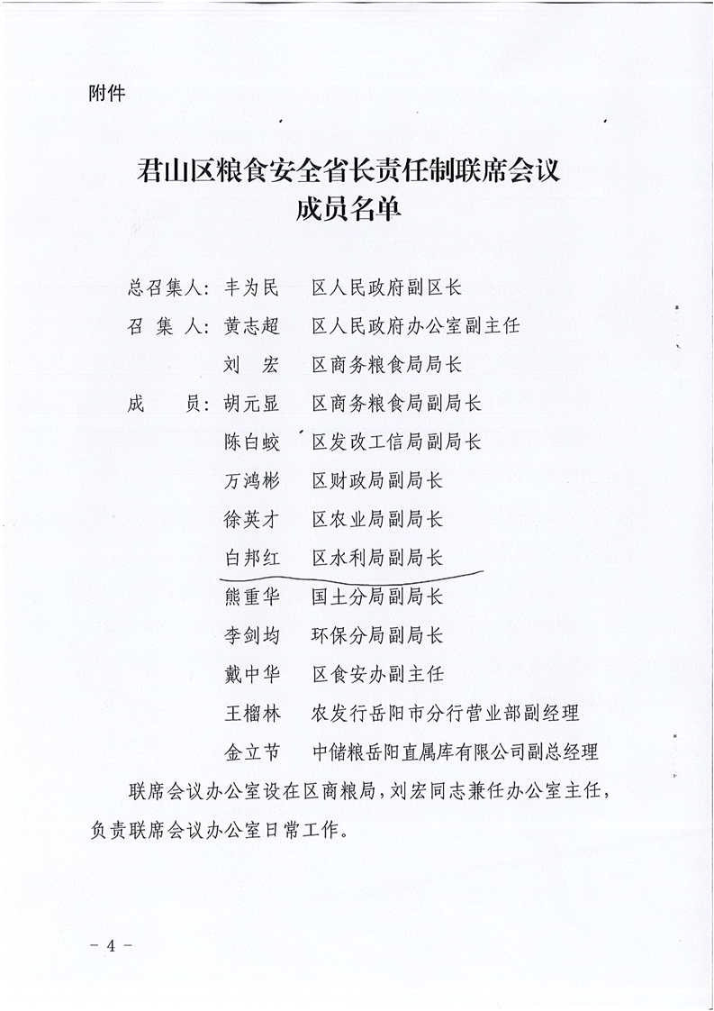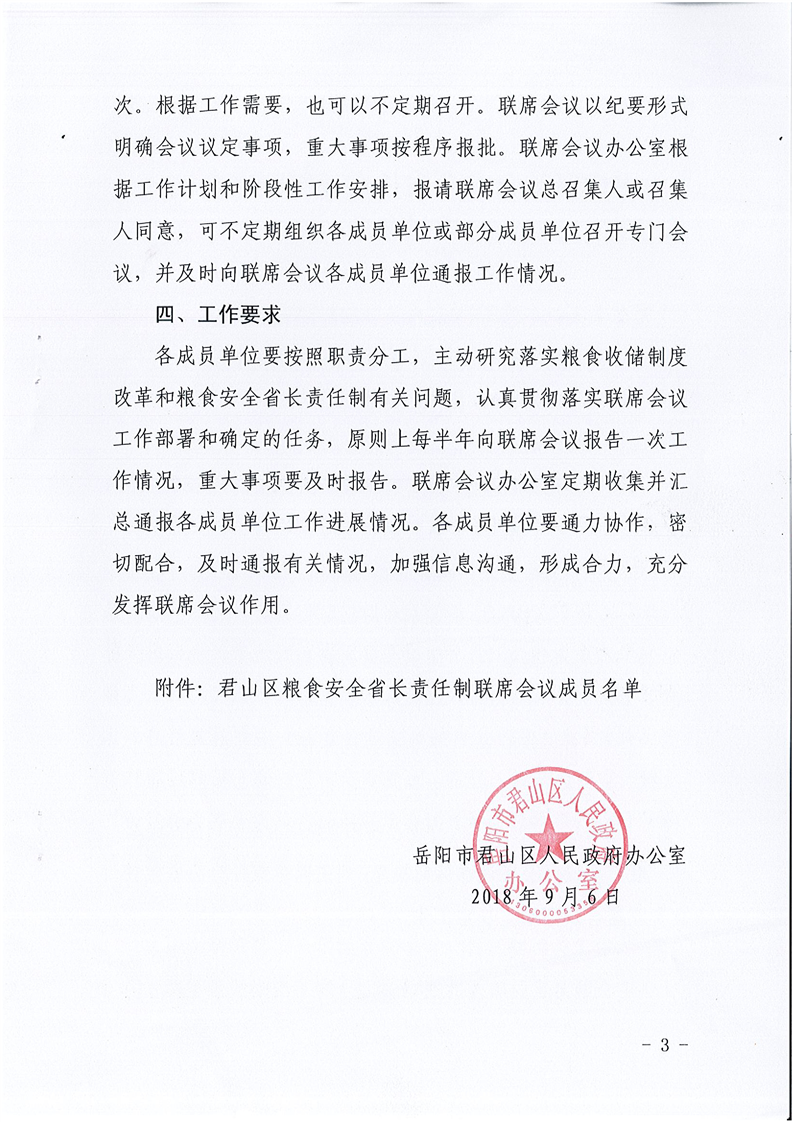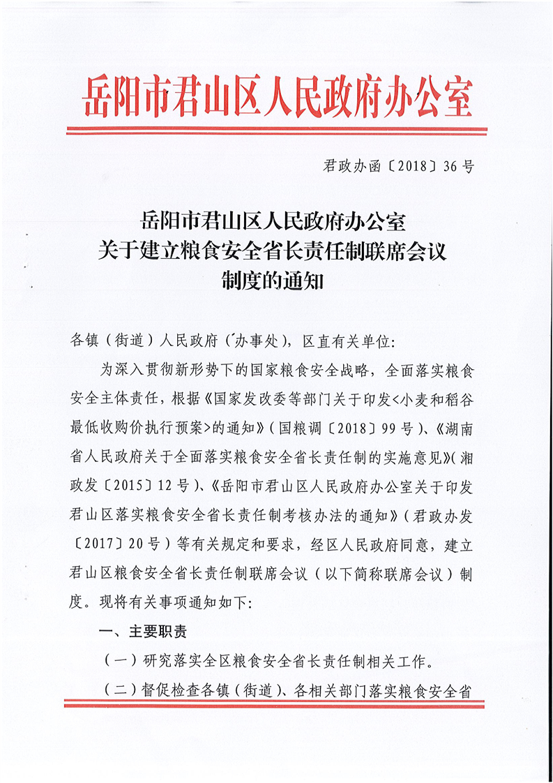 岳阳市君山区人民政府办公室关于建立粮食安全省长责任制联系会议制度的通知