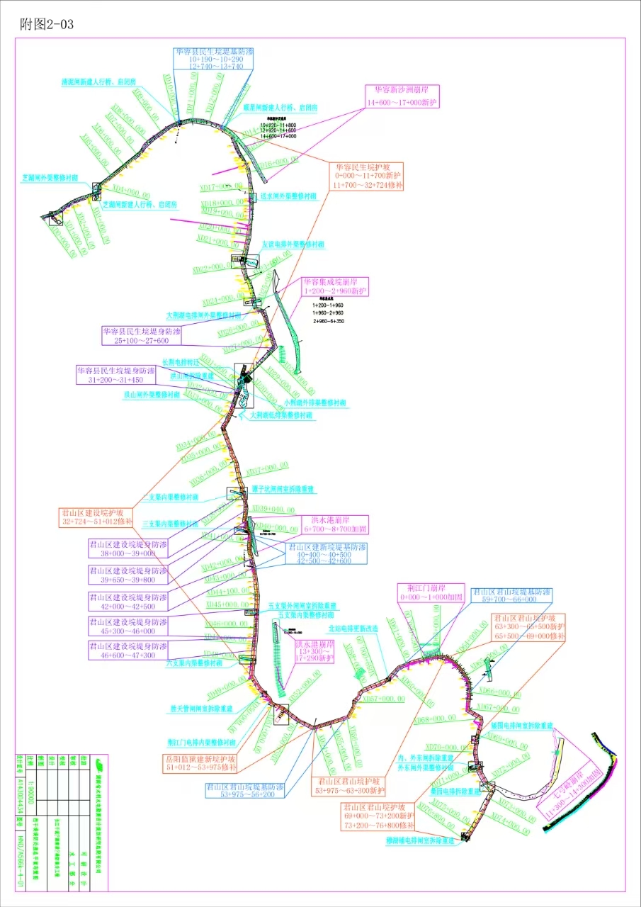 长江干流(湖南段)堤防提升工程涉及君山区建设垸、君山垸,主要建设内容如下:堤身防渗7.635km,堤基管涌防渗0.7km,白蚁防治41.113km,沟渠防渗衬砌13.2km,减压井25个,堤防边坡加固5.993km,岸线整冶3.99km,巡逻道路18.092km,穿堤建筑物新建及改造18处等防洪保安措施,以及对堤防全线信息监控和堤顶亮化,打造君山水文化生态公园,君山东站闸生态公园等项目。
