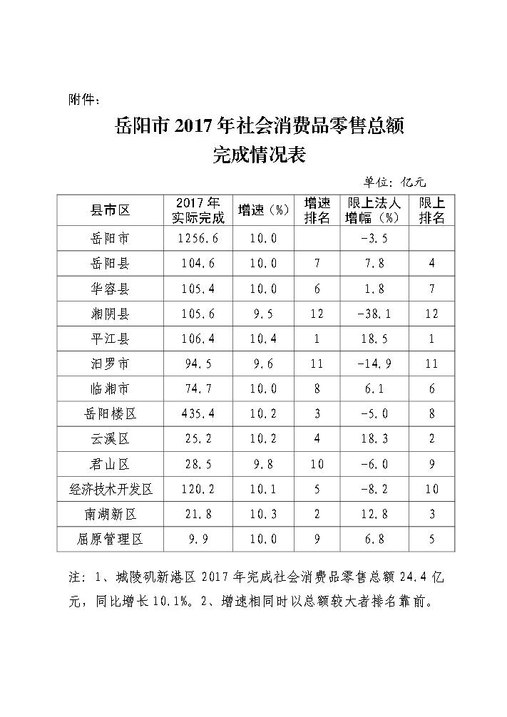 附件:岳阳市2017年度社会消费品零售总额完成情况表