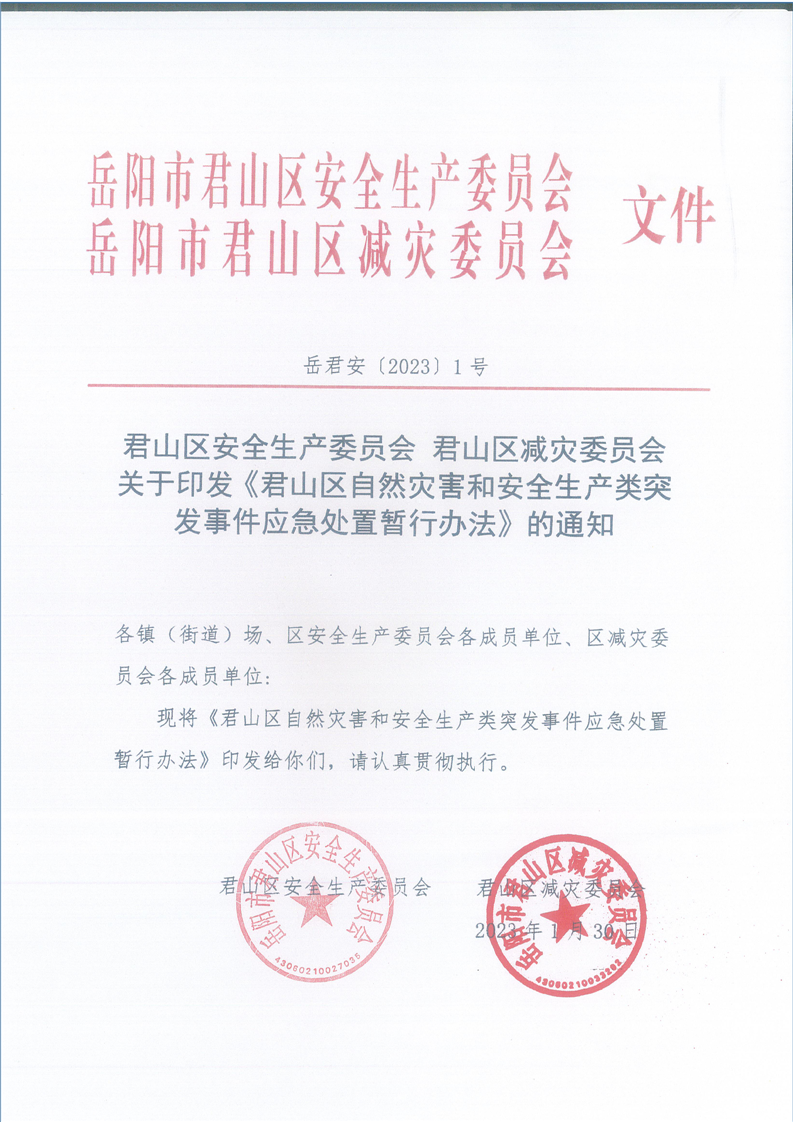 关于印发《君山区自然灾害和安全生产类突发事件应急处置暂行办法》的通知