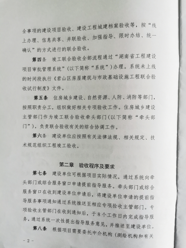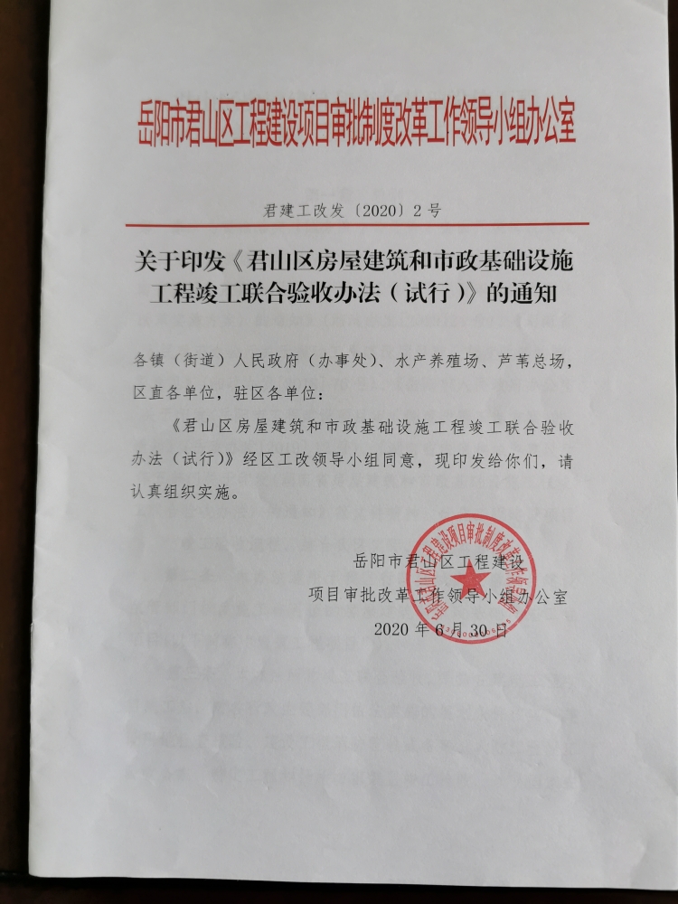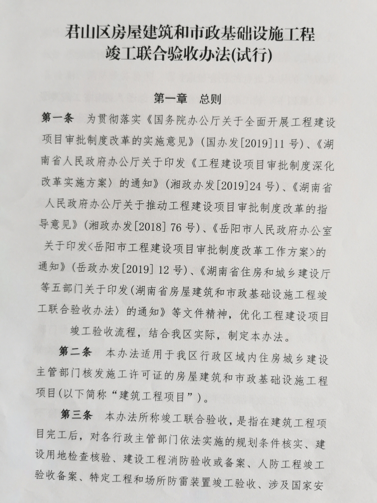 关于印发《君山区房屋建筑和市政基础设施工程竣工联合验收办法(试行)》的通知