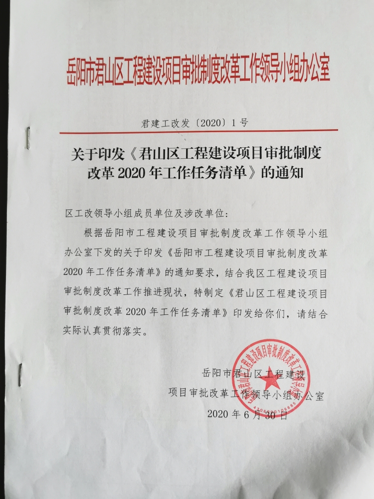 关于印发《君山区工程建设项目审批制度改革2020年工作任务清单》的通知