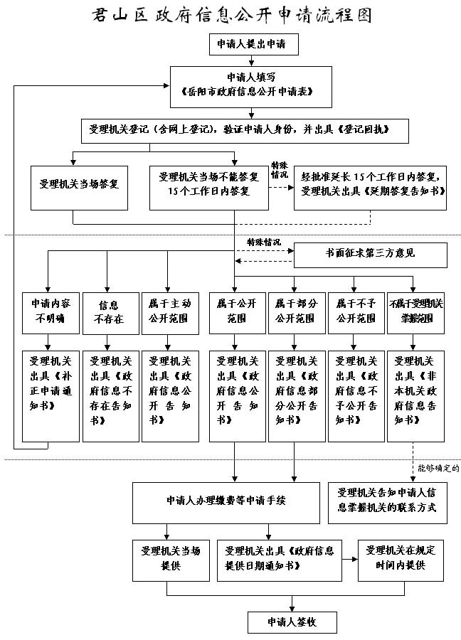 向本机关申请获取政府信息的,应当书面填写《君山区政府信息公开申请表》(以下简称《申请表》),对于书写有困难的可以口头申请,受理机构将代为填写。《申请表》可以在受理机构处领取,也可以在君山区人民政府网站上下载电子版,复制有效。
