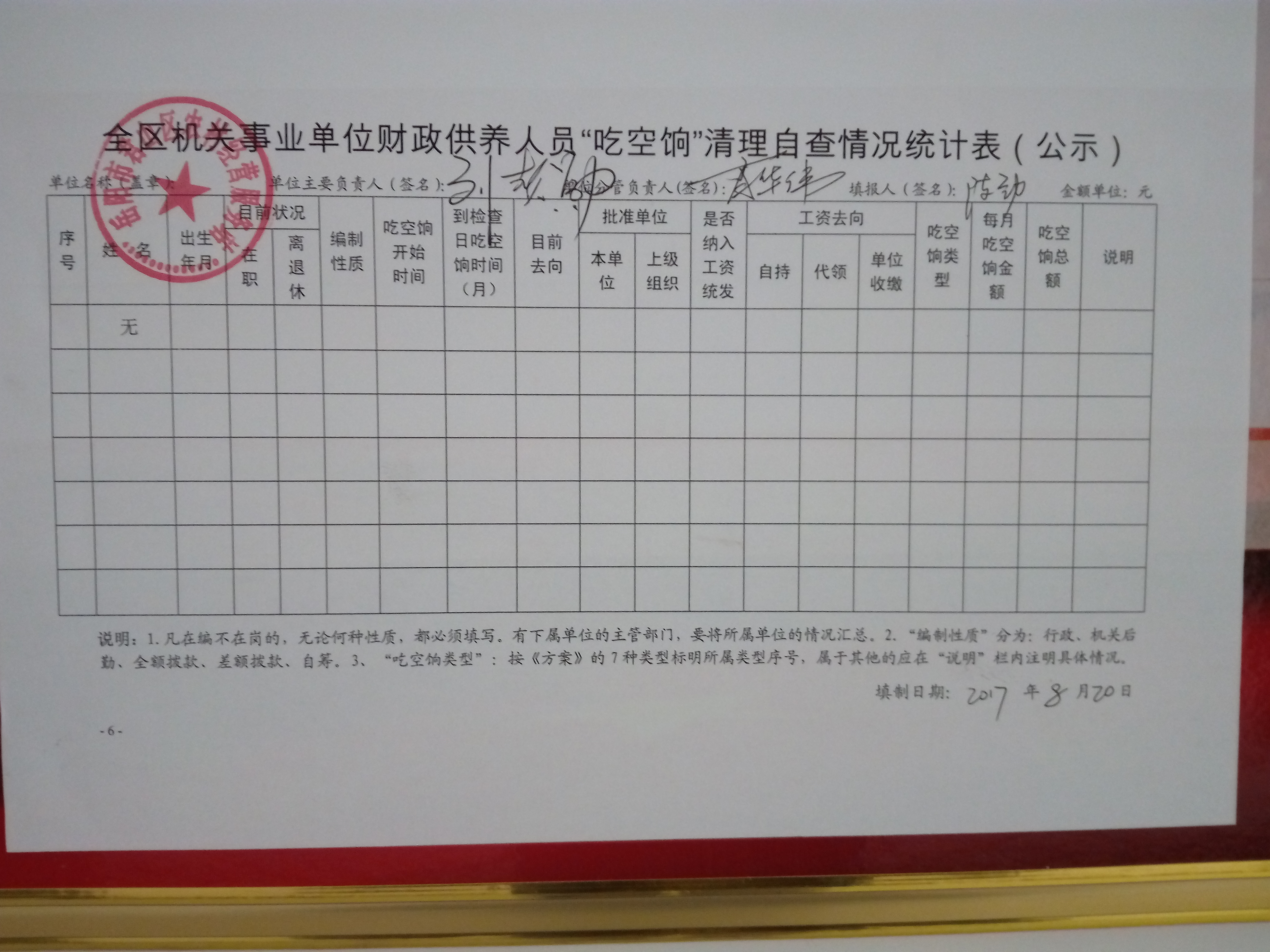 全区机关事业单位财政供养人员“吃空饷”清查自查情况统计表