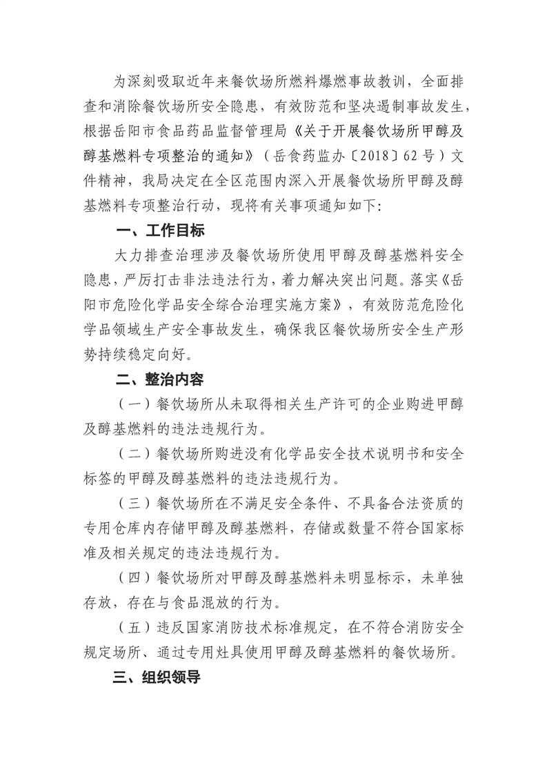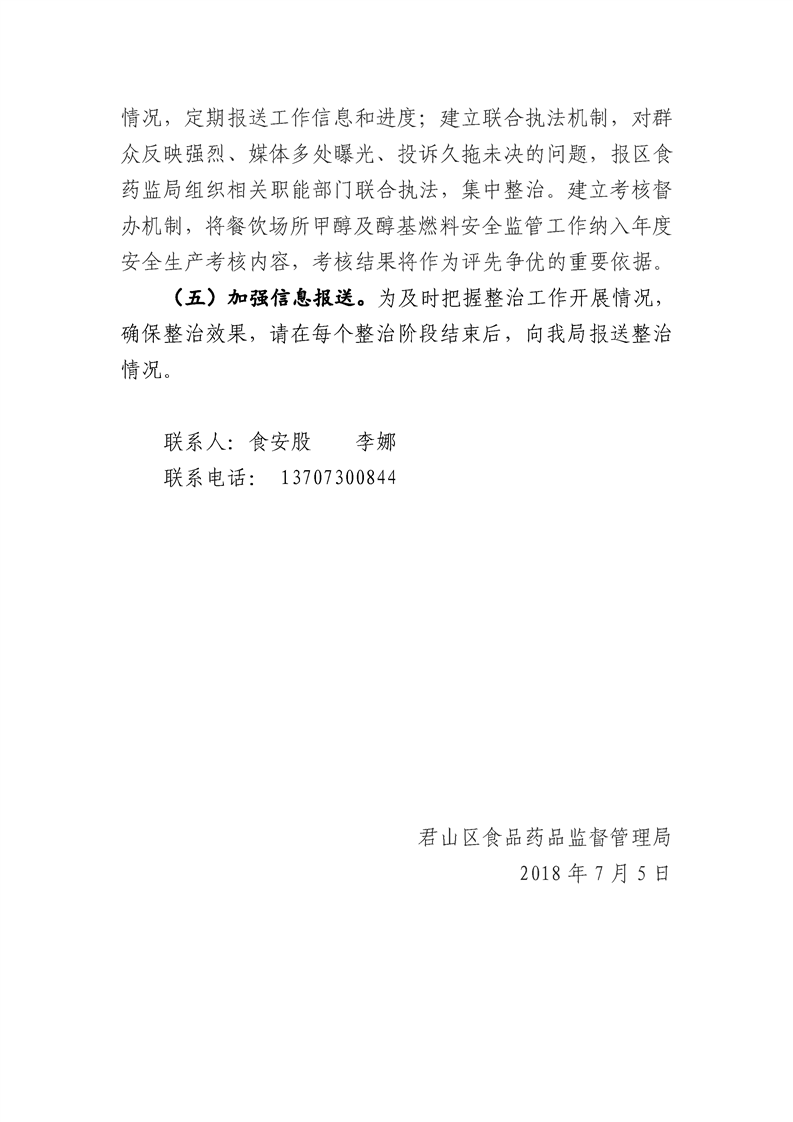 君山区食品药品监督管理局关于开展餐饮场所甲醇及醇基燃料专项整治的通知