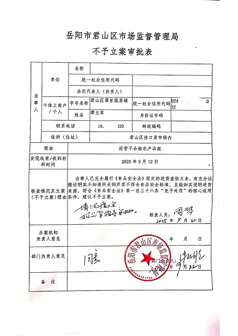 君山区市场监督管理局不予立案审批表(君山区谭家蔬菜铺)