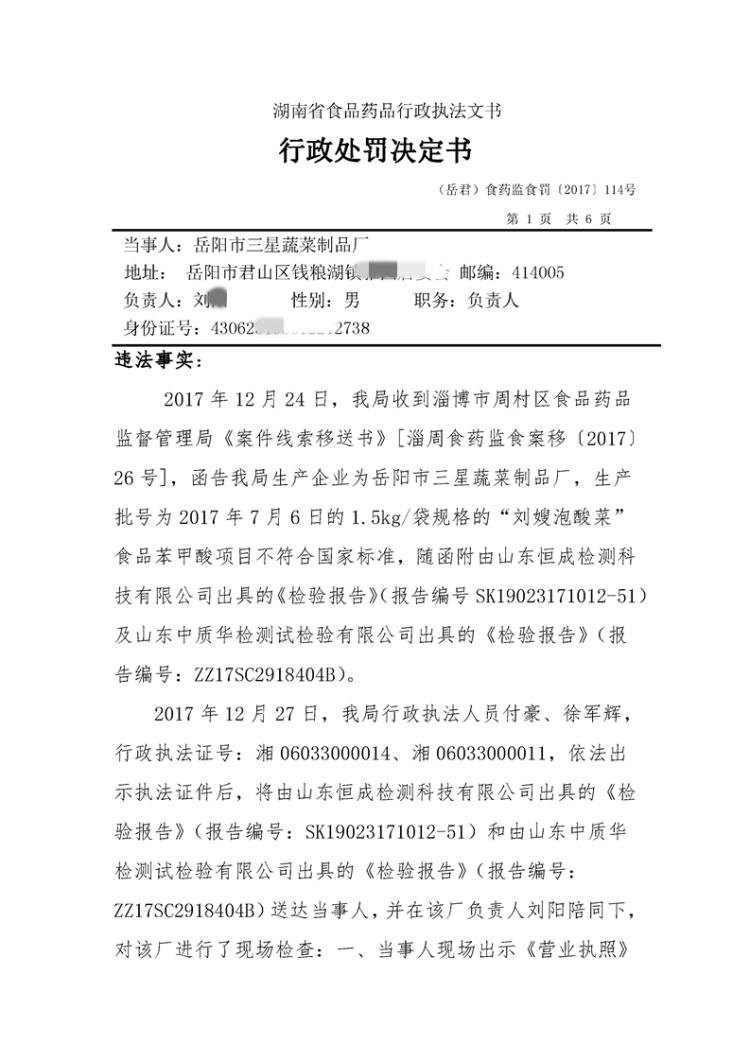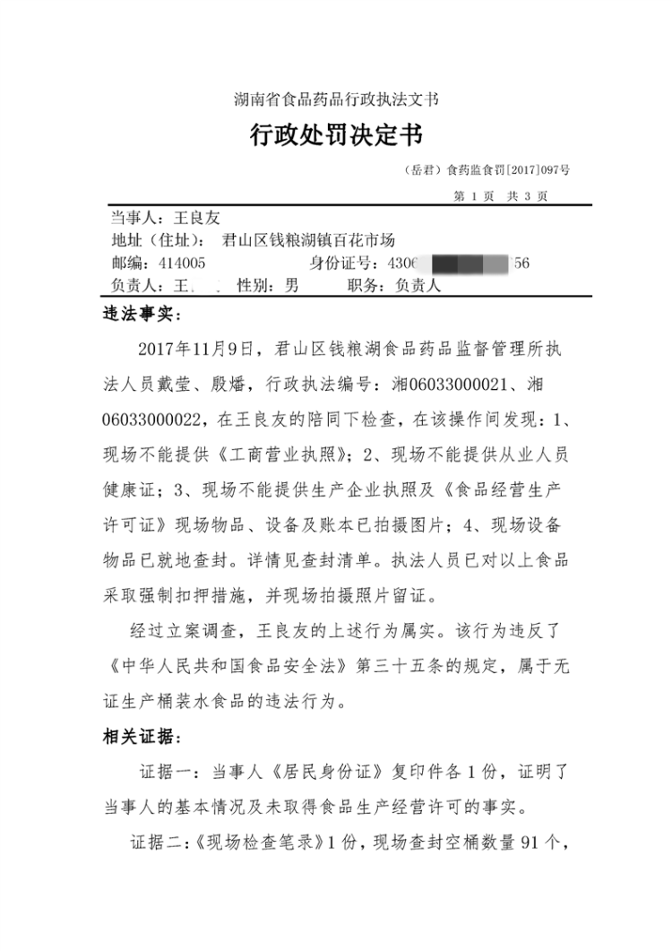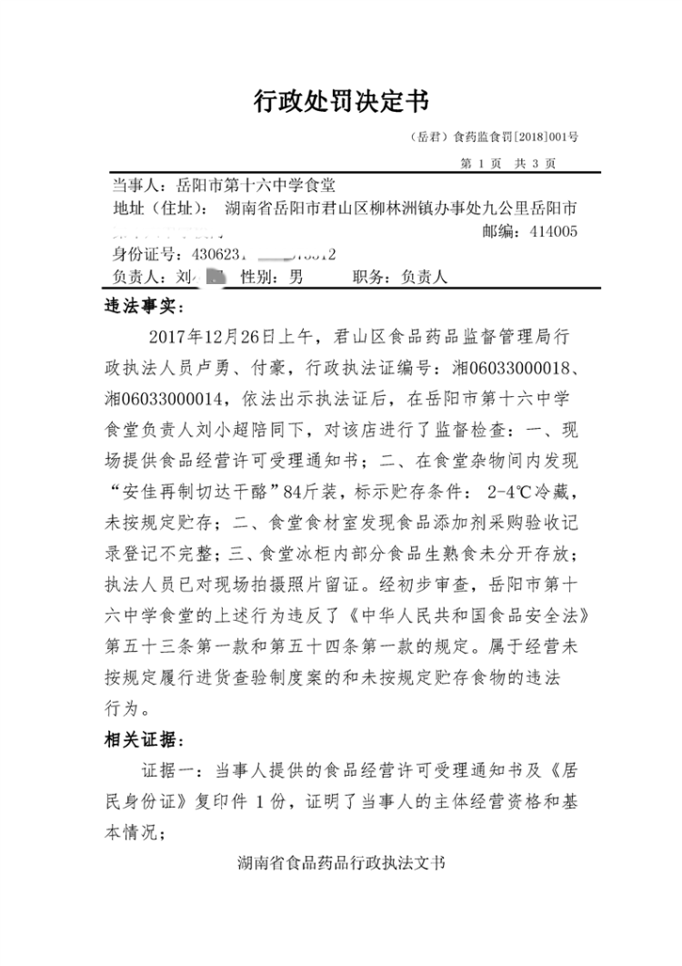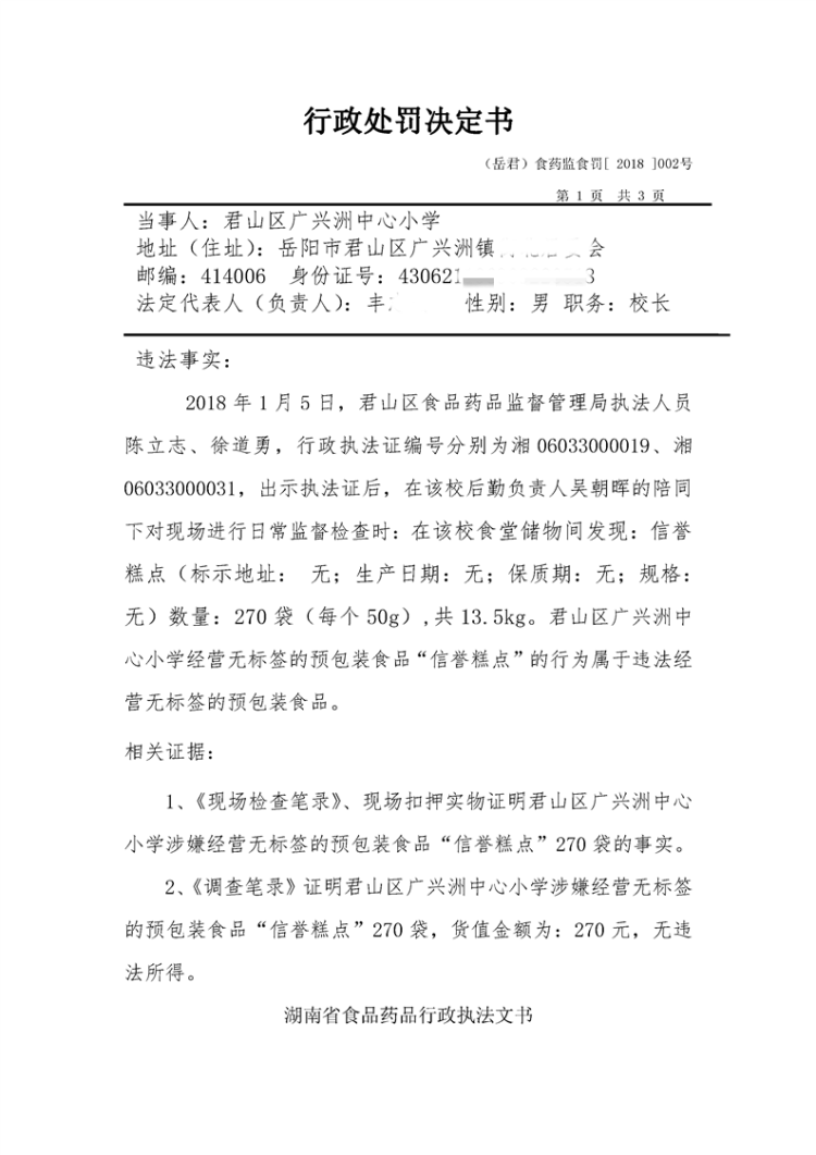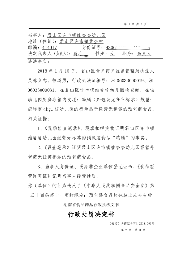 2018年3月君山区食品药品行政处罚信息公开表及行政处罚决定书