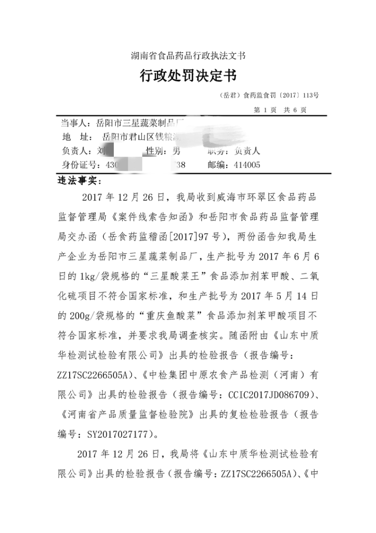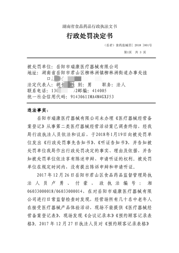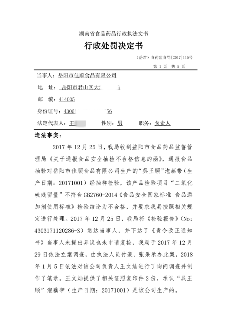 2018年2月君山区食品药品行政处罚信息公开表及行政处罚决定书