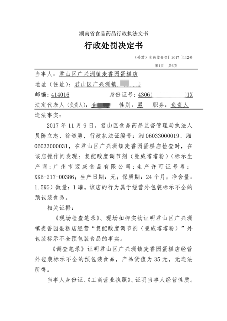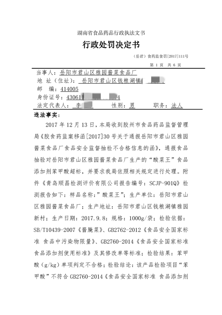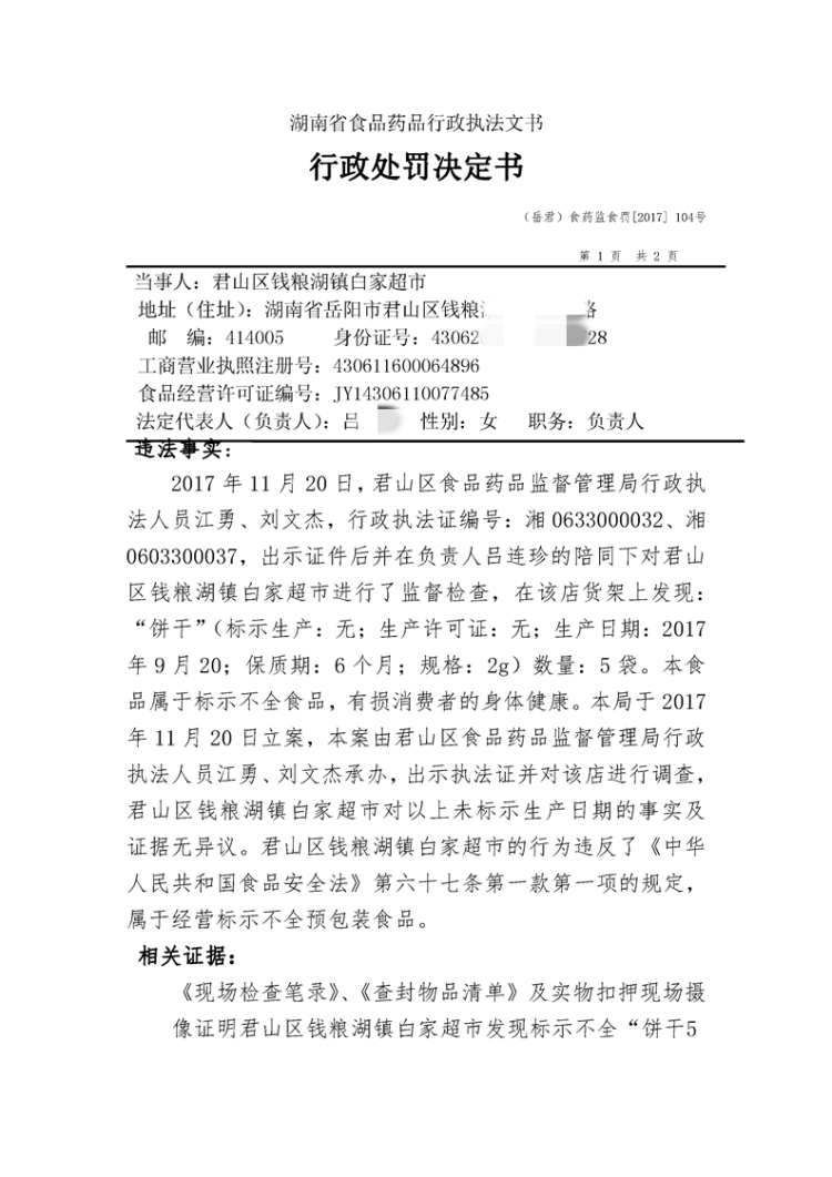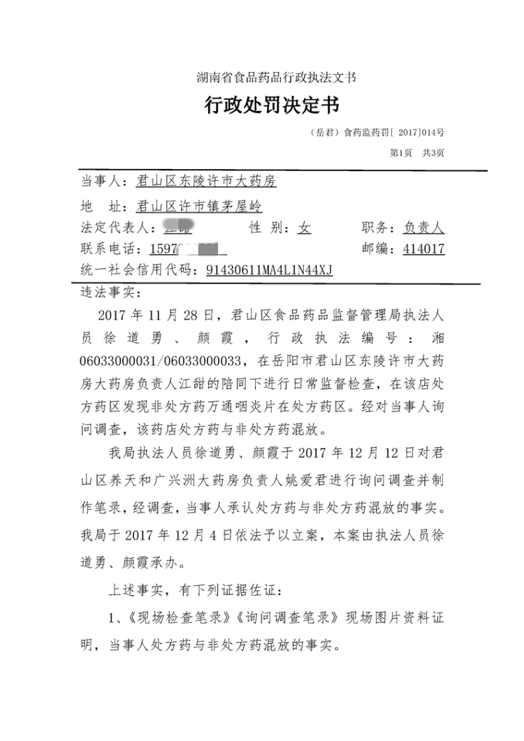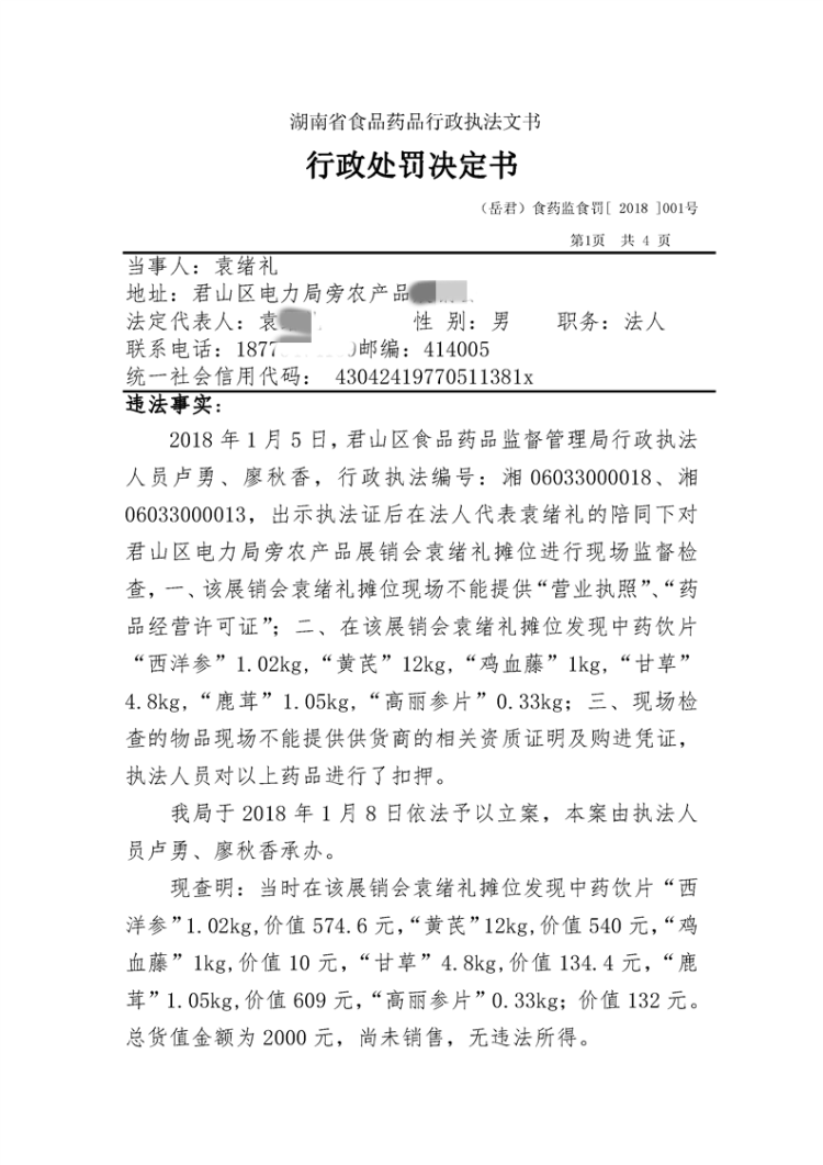 2018年1月君山区食品药品行政处罚信息公开表及行政处罚决定书