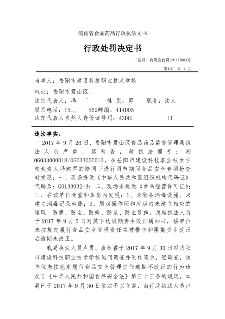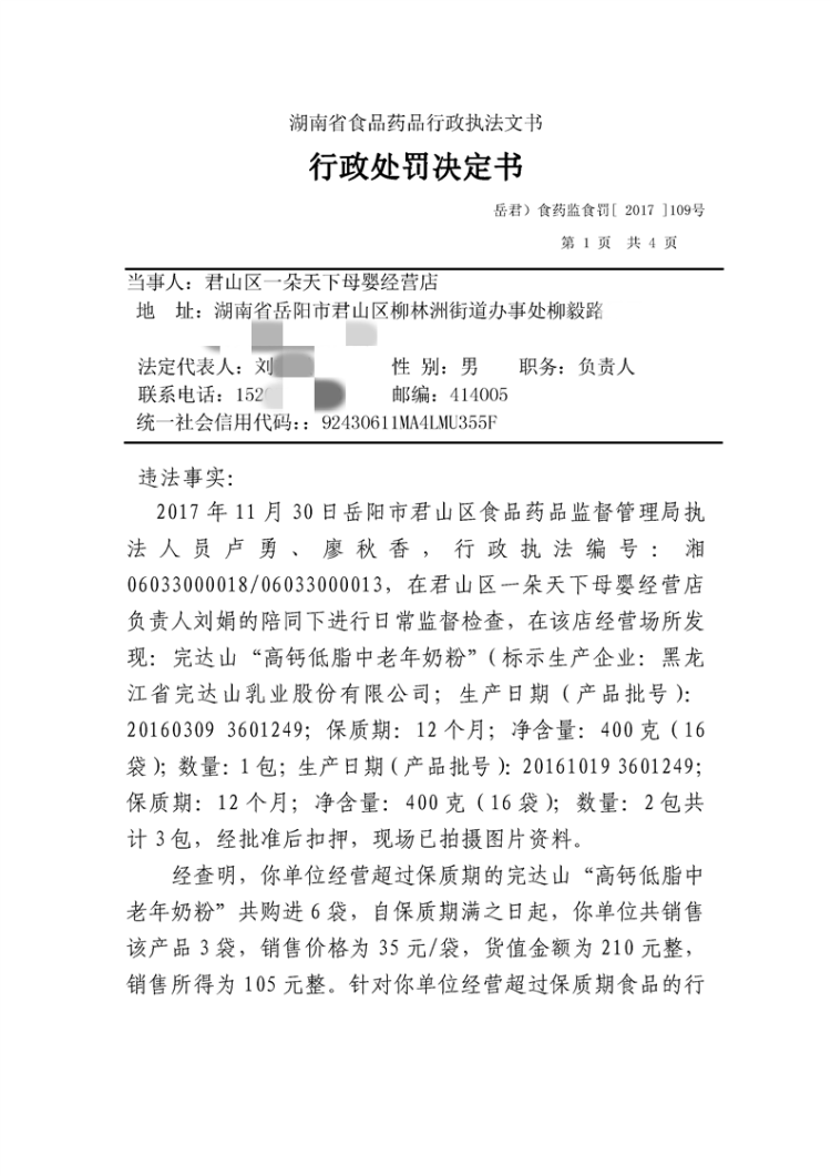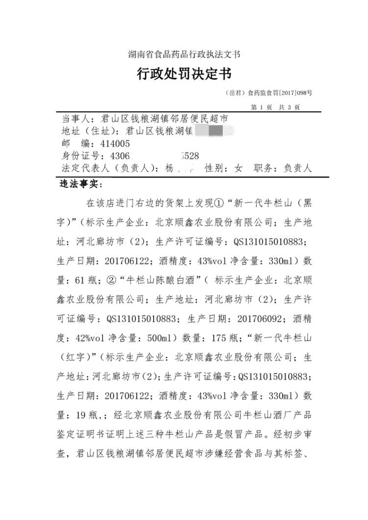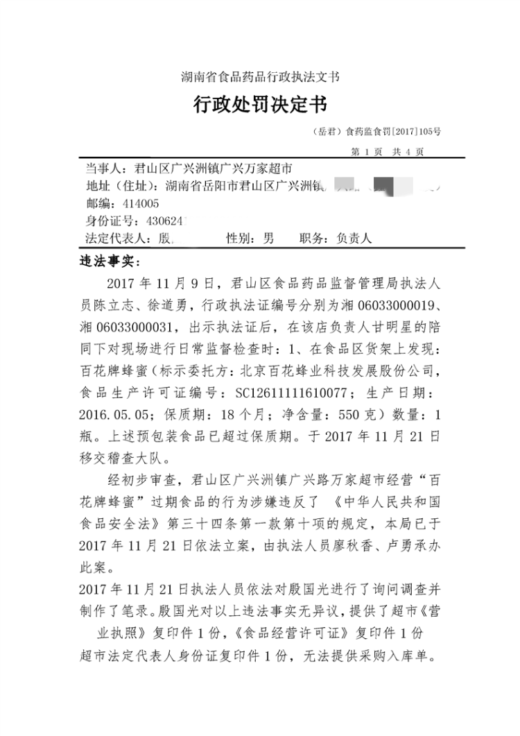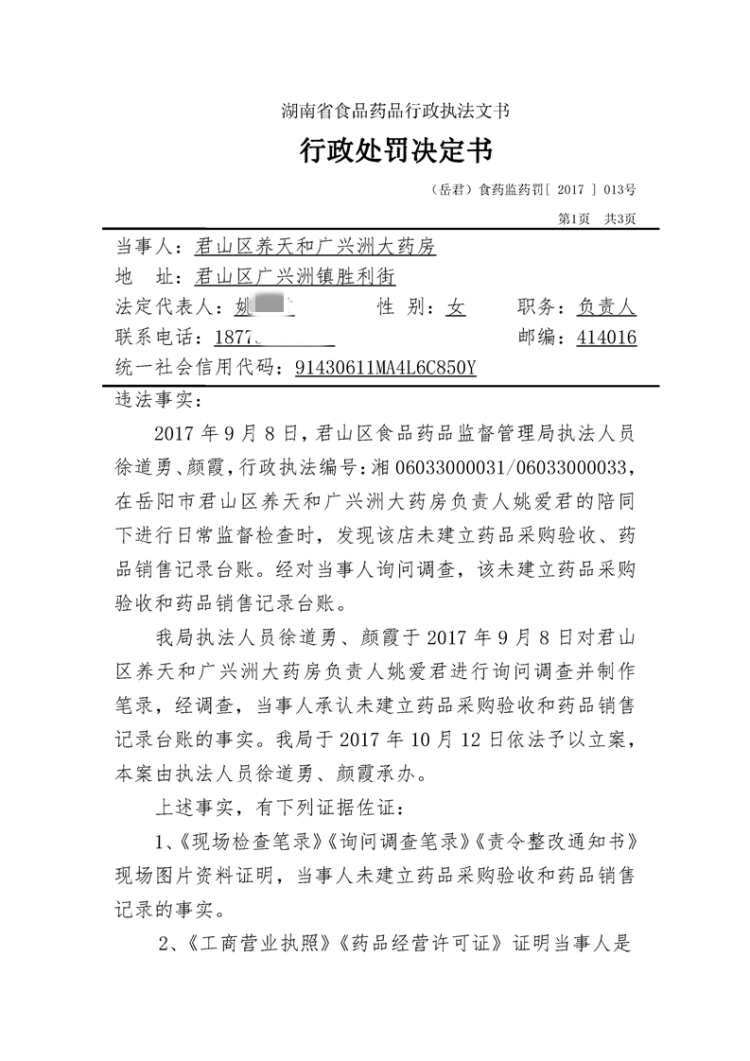 2018年1月君山区食品药品行政处罚信息公开表及行政处罚决定书