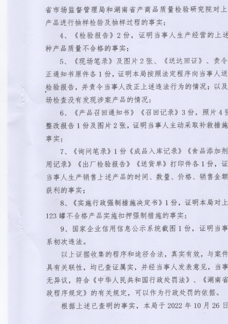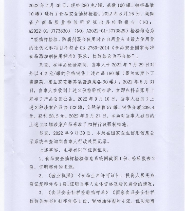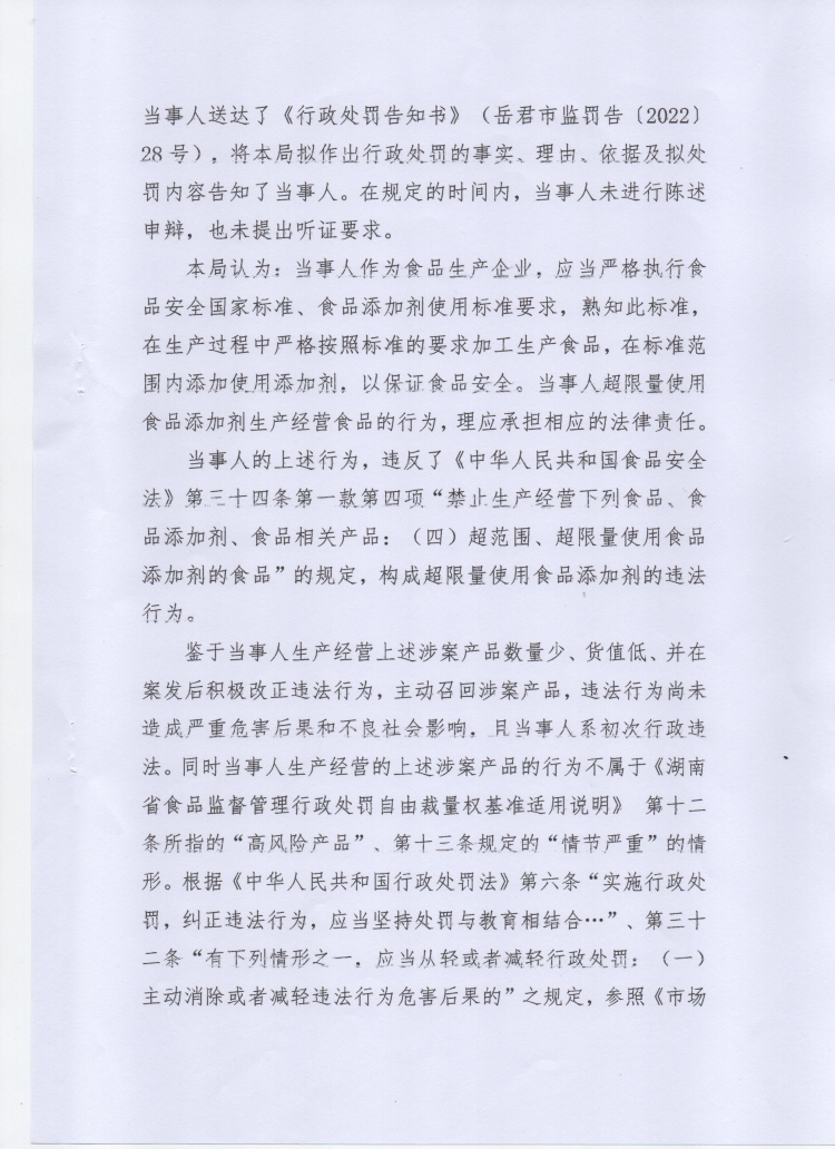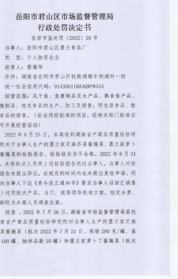 对岳阳市君山墨兰食品厂作出的《行政处罚决定书》