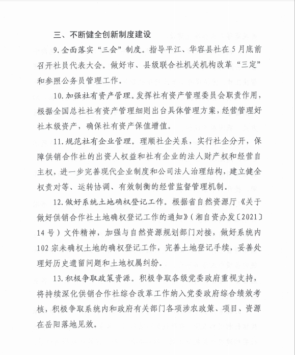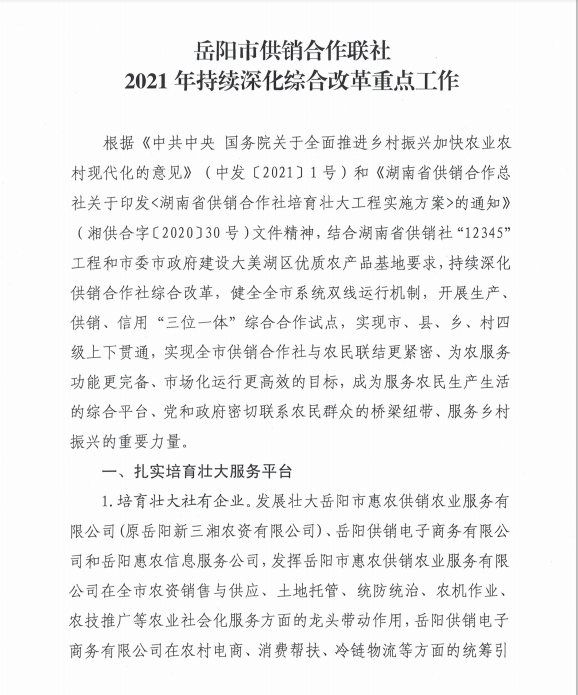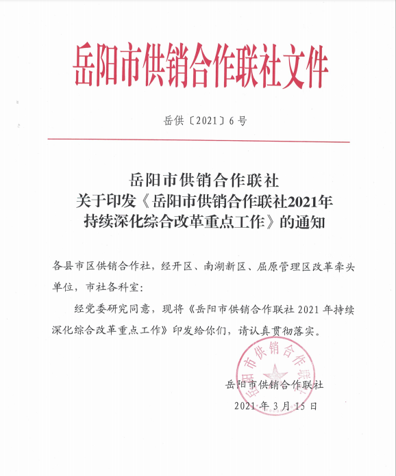 关于转发《岳阳市供销合作联社2021年持续深化综合改革重点工作》的通知