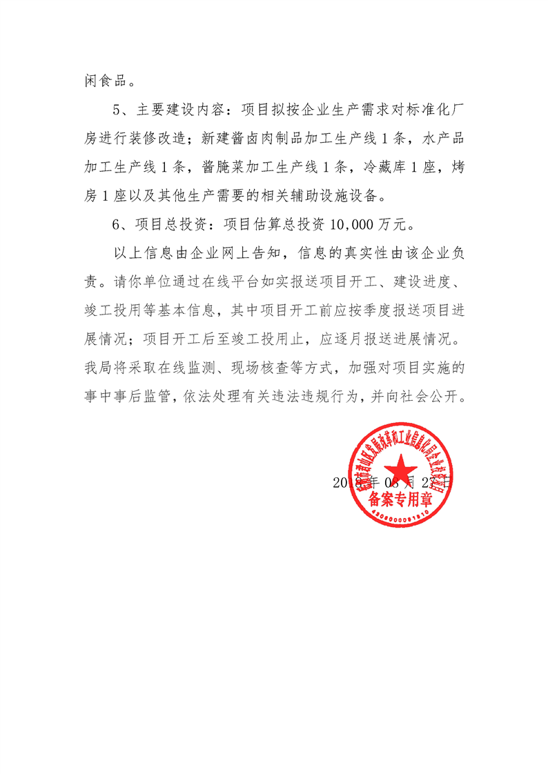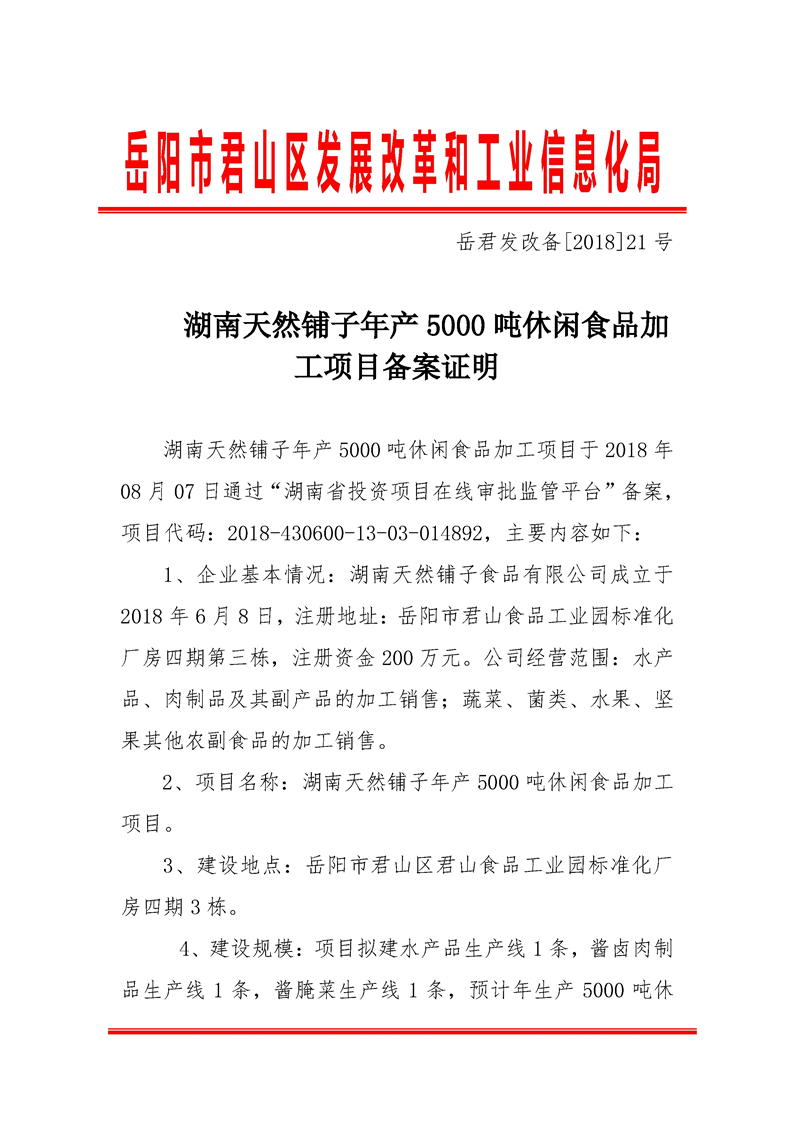 湖南天然铺子食品有限公司休闲食品加工项目备案信息