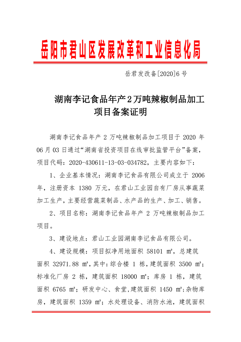 湖南李记食品年产2万吨辣椒制品加工项目备案证明