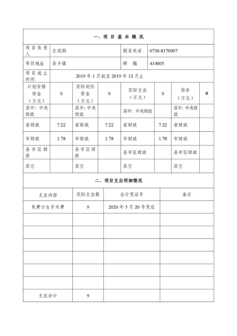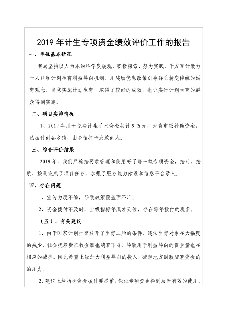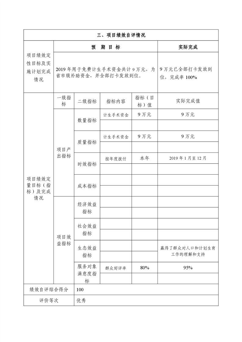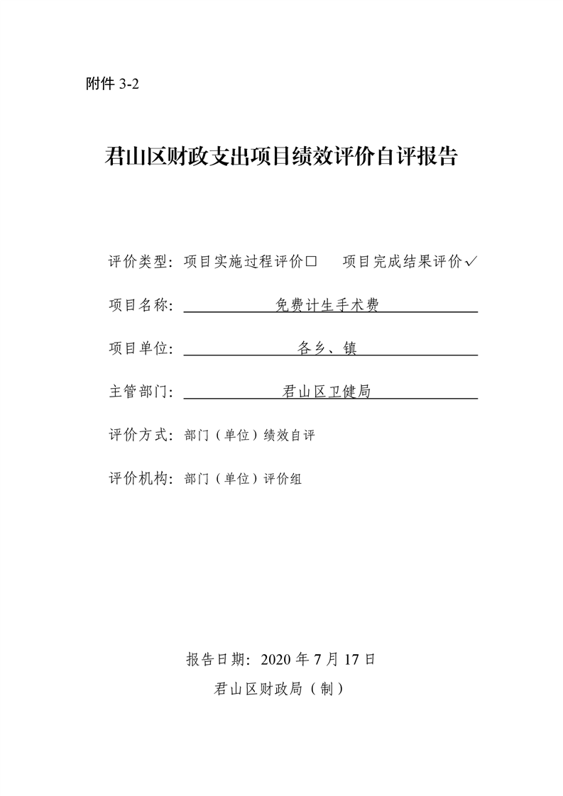 2019年度君山区卫健局免费计生手术费财政支出项目绩效评价自评报告